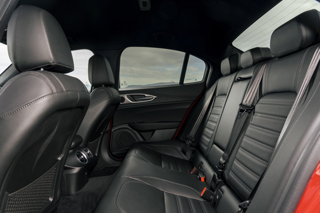 The presence of a auxillary jack input for the sound system under the central armrest dates the Giulia, as does the USB-A socket found next to it, but there are also newer USB-C type connections. All models now feature a wireless smartphone charging pad.