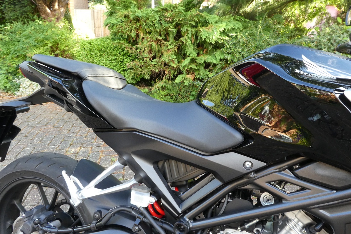For us, the front brake is also a bit of a stretch, a span adjuster would be a useful addition but you probably don't need to worry about that unless you're a female rider or have small hands. The back end is tall and there's a sculpted fuel tank that's larger than the ones on most other 125s. The result is that riders should feel more secure sitting on the CB125R because it feels like you're more tucked into it. -