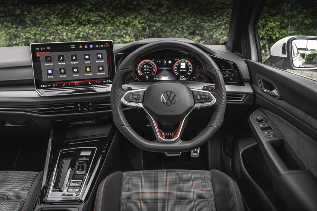 The Volkswagen Golf GTI uses the standard VW Golf in sportier R-Line form as its base equipment-wise. Standard equipment includes the usual 10-inch touchscreen with sat-nav and wireless smartphone connectivity, wireless phone charging, digital instruments, adaptive cruise control, three-zone climate control, 30-colour ambient lighting, a heated steering wheel, LED 'Plus' headlights with a cornering function and full-width light strip and the full roster of driver assists.